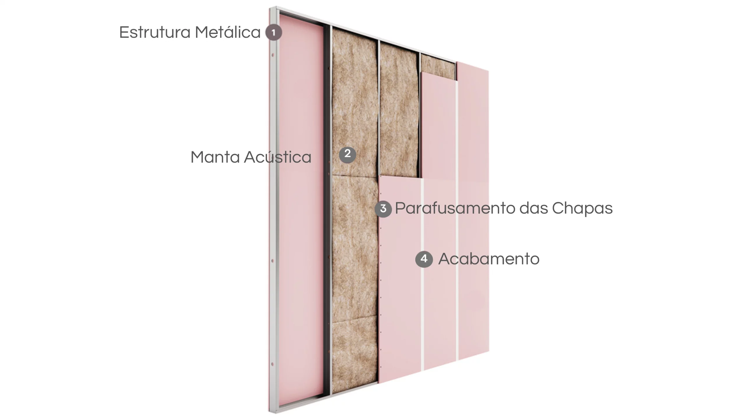 Parede Simples de Drywall é composta por uma estrutura com perfis, guias e montantes em aço galvanizado interligados por faixas de chapas de gesso, que pode ser preenchida com manta acústica.